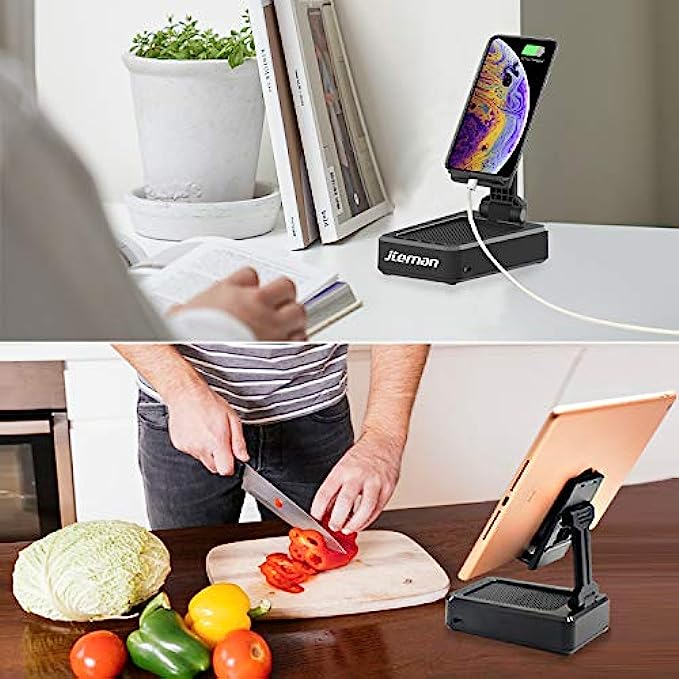 Wireless Bluetooth Speaker: This cell phone stand with portable Bluetooth speaker delivers stunning sound with enhanced bass, tight mids, and crystal clear highs without distortion at any volume. Moreover, the speaker comes with a built-in microphone.