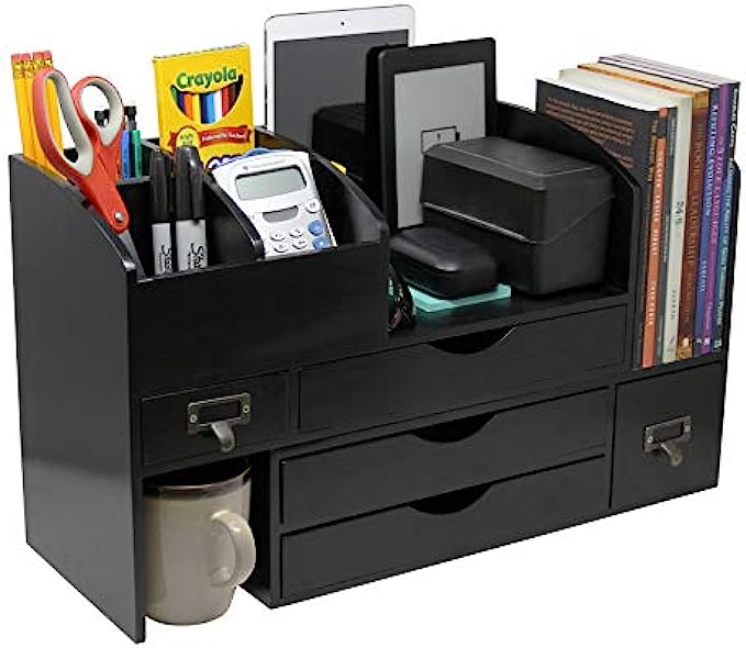 Executive Office Solutions Adjustable Wooden Desk Organizer For Desktop, Tabletop, Office or Counter – Wood Storage Shelf Rack For Office Supplies, Desk Accessories, or Mail – Black