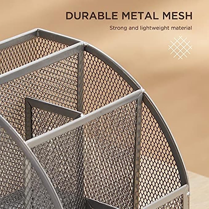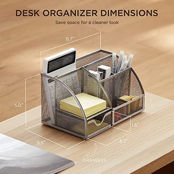 【SOPHISTICATED DESKTOP STORAGE】This desk organizer measures 8.7(L) x 5.5(W) x 5(H) inches and weighs 1.37 lbs. Mesh desktop organizer is perfect for dens, desks, dressers and workbenches, use it as a pencil holder, pen holder, desk organizer, makeup organizer or small tool organizer