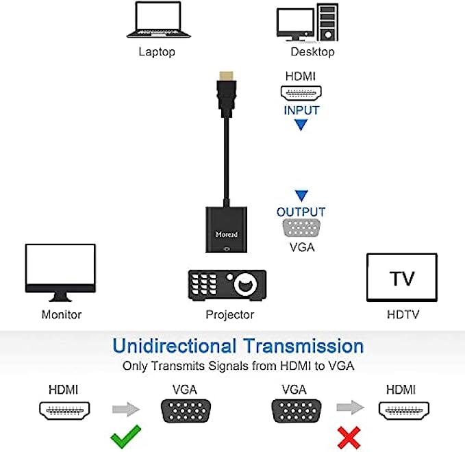COMPACT DESIGN - The compact-designed portable Moread HDMI to VGA adapter connects a computer, desktop, laptop, or other devices with HDMI port to a monitor, projector, HDTV, or other devices with VGA port; Tuck this lightweight gadget into your bag or pocket to do a business presentation with your laptop and projector, or extend your desktop screen to a monitor or TV; A VGA cable is required (sold separately)