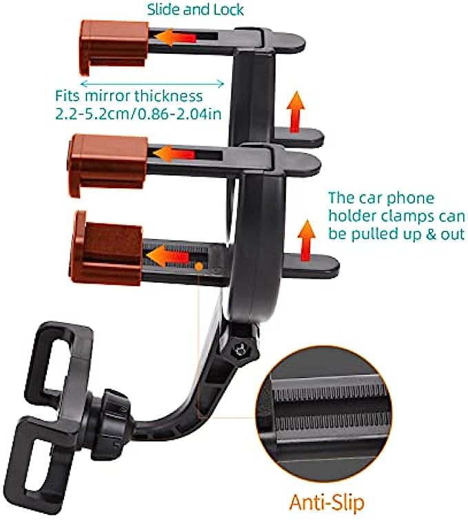 • Widely Compatible Cell Phone Automobile Cradle: The car holder for cell phone extendable clamps can clip to different thickness(2.2-5.2cm/0.86-2.04in) & height(5.3-8cm/2.08-3.15in) of rear view mirrors, and perfectly fit most vehicles such as trucks, pickup trucks & SUVs (not for rear view mirrors with a row of buttons or thickness more than 2.04”)