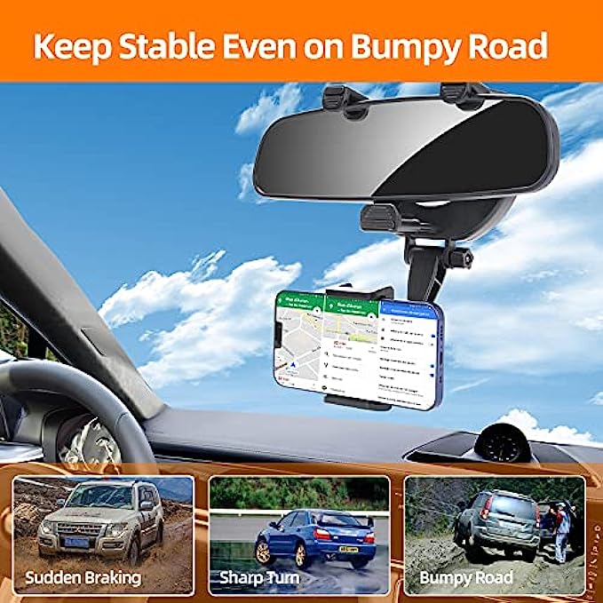 • Stable Car Phone Mount: it grips your mirror firmly and phone mount grips your phone firmly even on bumpy roads,The non-slip silicone rubber on holder increases the clamping power & protects rear view mirrors and your phone from scratches