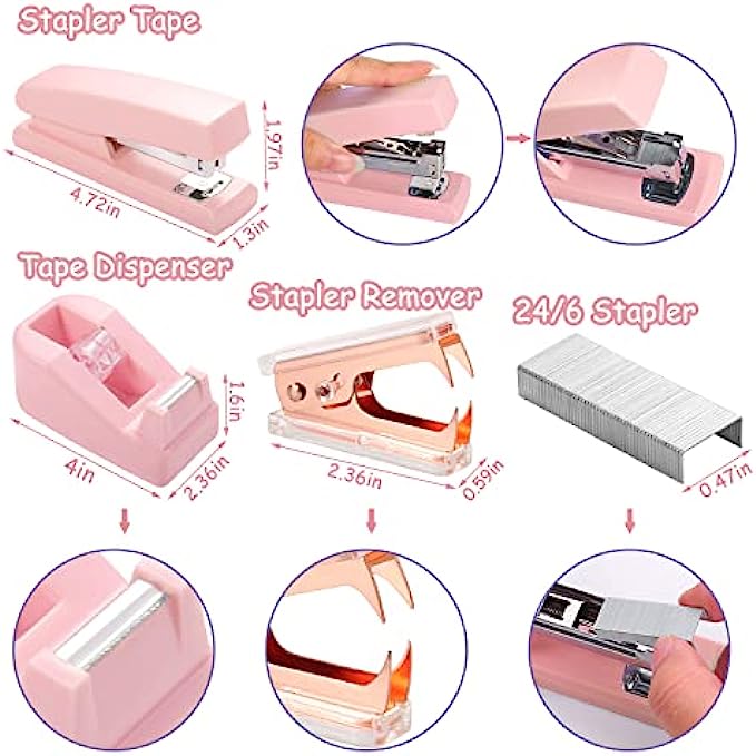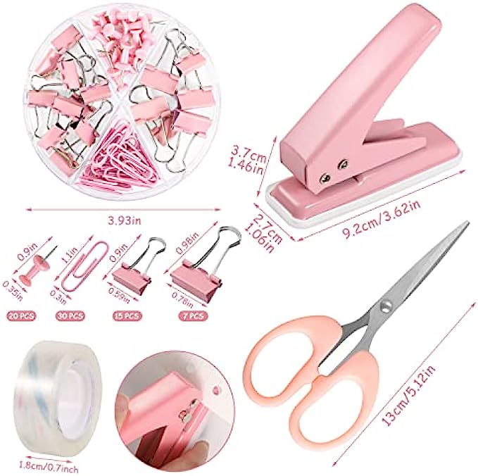 【Size Details】You will receive pink desk accessory kit, including 1 stapler (4.72*1.3*1.97inch), 1 staple remover (2.17*0.6inch), 1 tape dispenser (4*2.36*1.6inch), 1 Hole punch (3.66*1*1.38inch), 1 roll of transparent tape (0.7inch), 1 box of binder clips (3.93inch), 1000 staples (24/6), 1 scissors (5.12*2.44 inch).(Please note: the set comes in 2 shades of pink, the hole punch is dark pink, please confirm before purchasing)