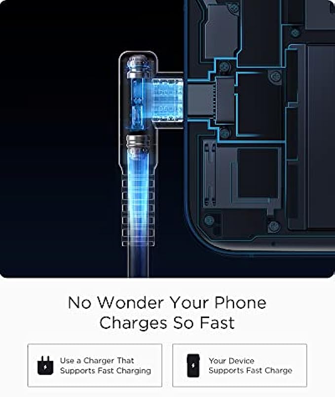 [Upgraded Exclusive Right Angle Design] This right angle type c charging cable fast charge with an innovative 90 degrees " L " design. It's user-friendly design more convenient and comfortable for playing games, watching videos, reading e-books when you charging. 【 NOTE: The thickness of the compatible mobile phone case charging port is 5.5mm.】