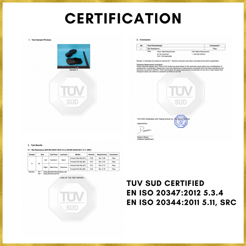 Colour:Black Material Quality:Good The item was packed nicely. The delivery was fast received within 2 days. Bought for my son for his f&b partime job. It is slightly loose but wearing thick socks will be fine. Very light weight. Have not used it for work so not sure whether the sole really grips or not on a slippery surface.