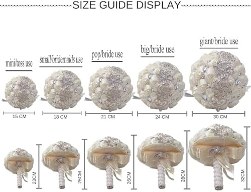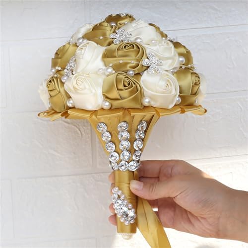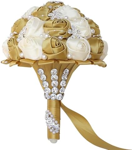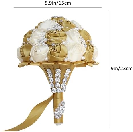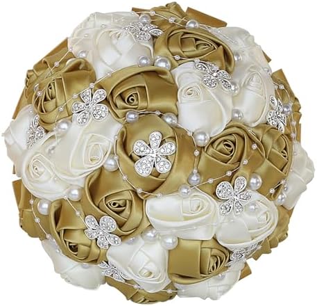 Sponsored Ad - Handmade Wedding Flowers Bridal Bouquets Crystal Bride Holding Bouquet Toss Round Artificial Satin Roses with Pearl Diamond Crystal Ribbon Light Gold and Creamy 5.9 Inch