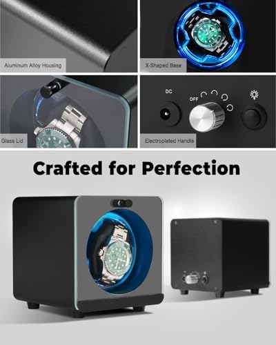 Cevale Single Watch Winder,Aluminum Automatic Watch Winder for Rolex with Ultra Quiet Motor(≈0dB),Self-Winding Metal Watch Winder for Every Watches,Blue Light,Gift for Watch Lovers