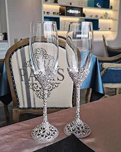 Champagne Flutes - Crystal Glass Metal Base With Crystal Stones, Set of 2 Toasting Flute Pair, Wedding Anniversary Party Birthday Banquets and Gifts for Bride and Groom(Silver)