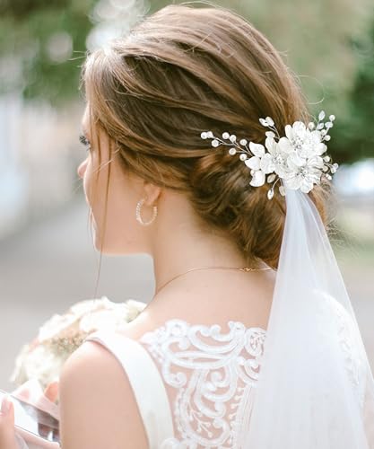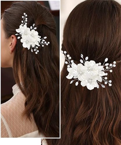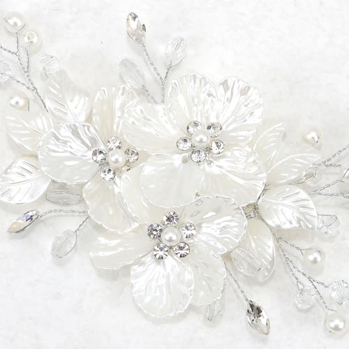 Chanaco Bridal Wedding Hair Accessories Flower Hair Clips and Pieces for Brides - Non Slip Silver Pearl Rhinestones Crystal Fancy Barrettes and Decorations for Women and Bridesmaids