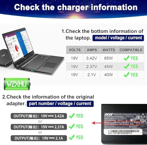65W Laptop Charger Compatible with Acer Aspire E15 E5-575 V5 V7 V3 R3 R7 S3 E1 M5 F5 F15 Series 5517 5250 5253 5336 5349 5532 5534 5552 5560 5733 5742 Power Supply Cord AC Adapter