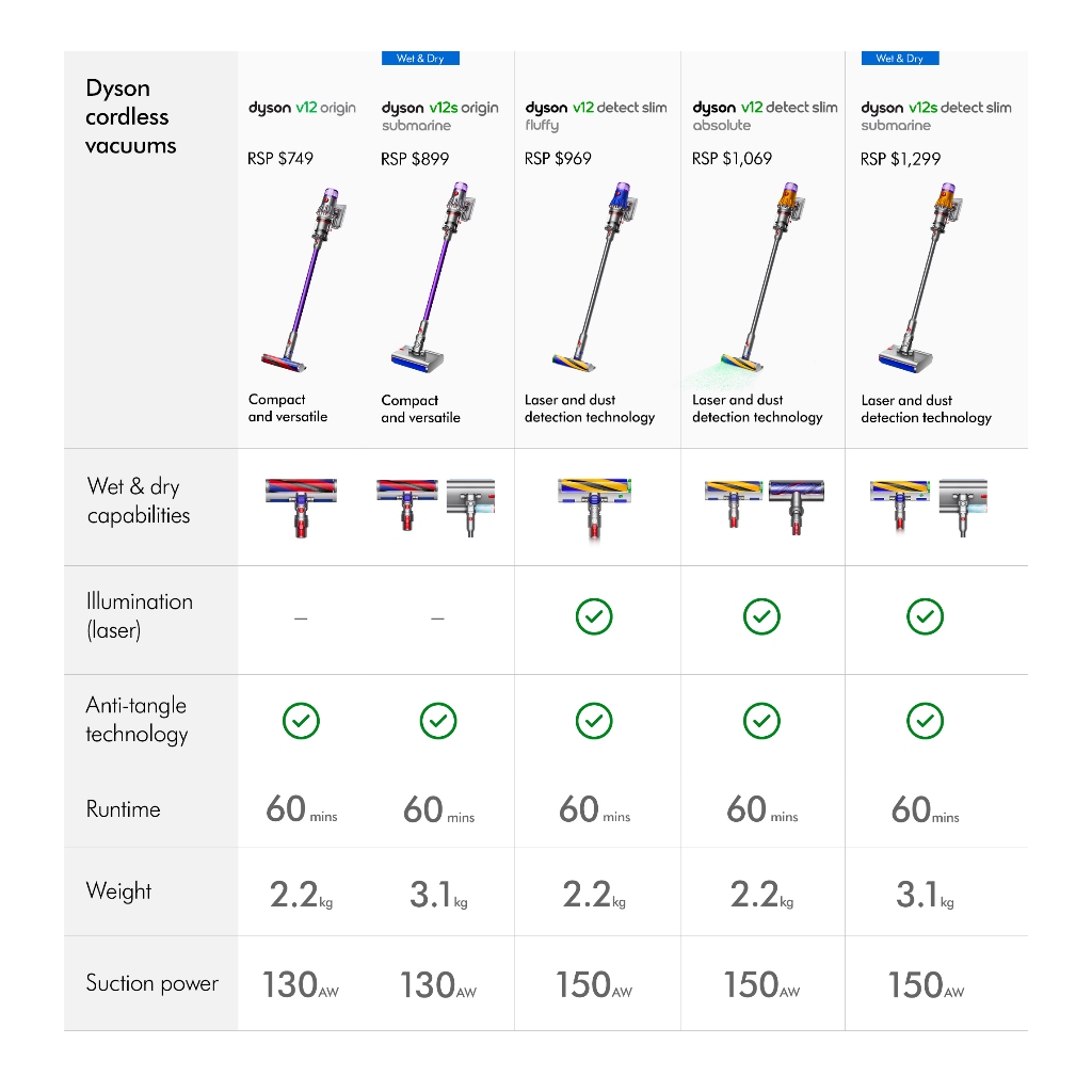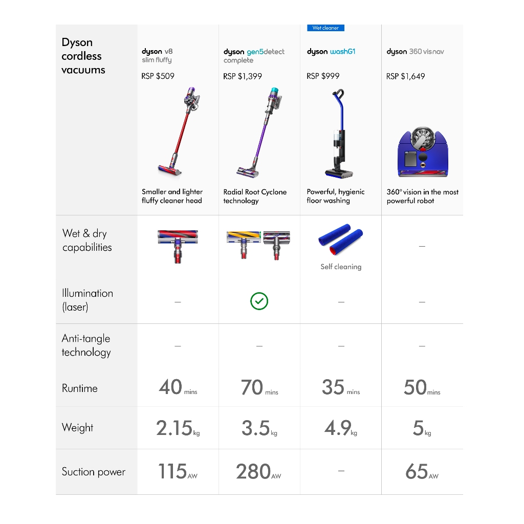 Best Feature(s):lighter than my previous one Performance:Good Value For Money:yes. value for.money!! We like Dyson. Good suction power. The slim detect is very good. But pricier. This one works well enough. Small brush head, works better in lower tighter conrers