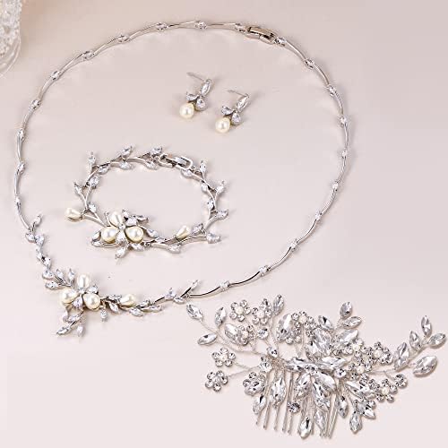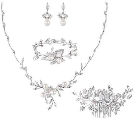 Sponsored Ad - EVER FAITH Marquise CZ Simulated Pearl Bridal Flower Leaf Filigree Necklace Earrings Bracelet Set