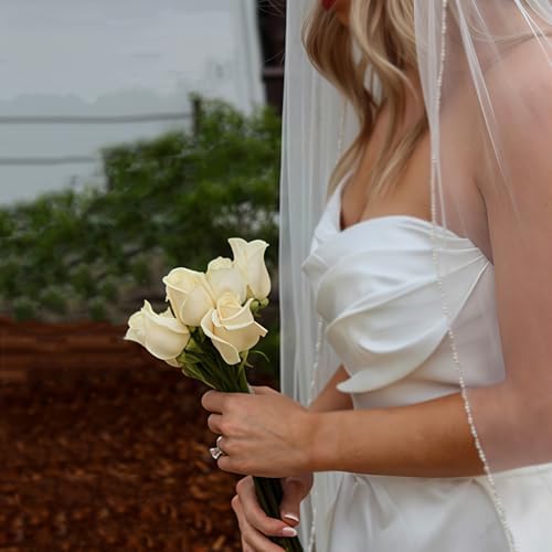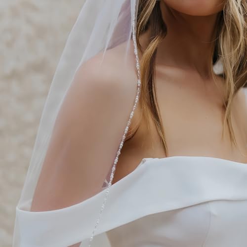 Wedding Veil Pearls and Crystals Beaded Edge 1 Tier Fingertip Length Bridal Veil
