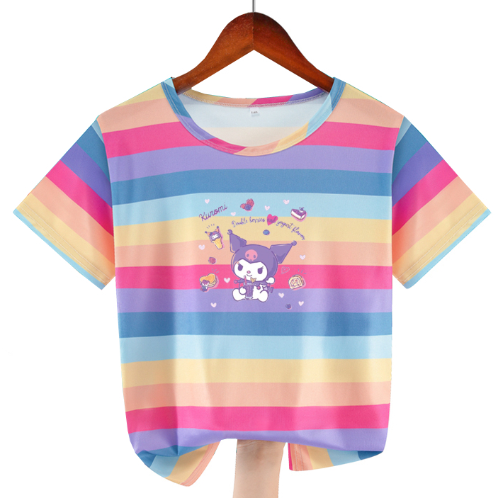 Material Quality:stretchable Colour:nice rainbow colour Received the girl rainbow print ice silk T-shirt in good condition. Stretchable material.