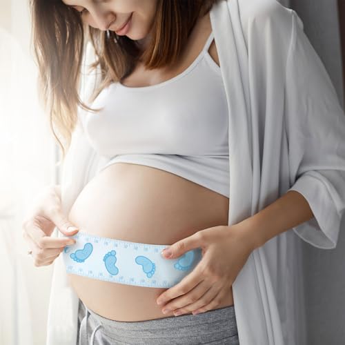 1 Roll 75 Inch Baby Shower Blue Measuring Tape Belly Measure Game with 12 Footprint Stickers Tommy Measuring Tape for Baby Shower Games Party Decorations Supplies