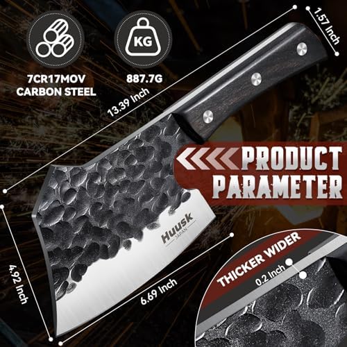 Huusk Meat Cleaver Knife Heavy Duty Bone Chopper, Hand Forged Kitchen Axe with Sheath, Full Tang Bone Chopping Knife, Japanese Butcher Knife for Meat Cutting, Kitchen Father Gift Idea Men