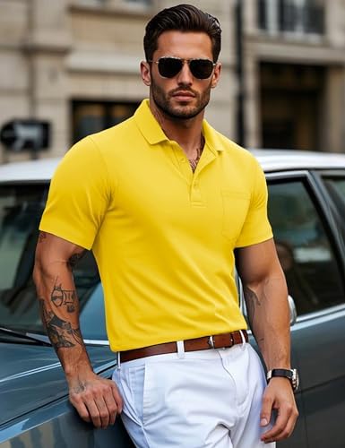 Mens Polo Shirts Short Sleeve Cotton Pique Golf Shirts with Pocket Casual Performance Moisture Wicking Polos Yellow XL