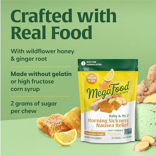 MegaFood Baby & Me Prenatal Morning Sickness Relief, Ginger Chews, with Vitamin B6, Made Without 9 Food Allergens, Honey Lemon Ginger Flavor, 30 Chews (Pack of 2)