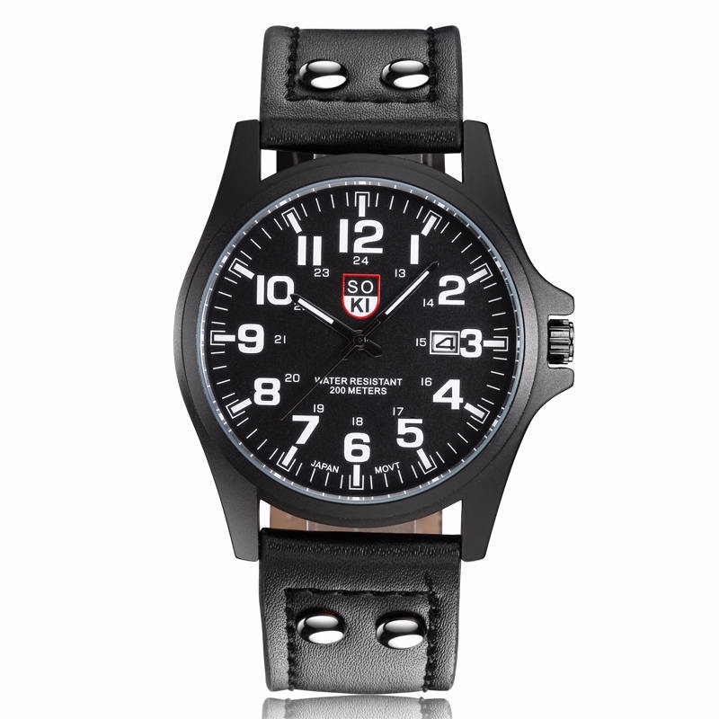 Colour:black Material Quality:pvd black stialness steel case and faux leather strap. Nice military watch design with lume hands and date complication. Case is 42mm with 22mm lug width
