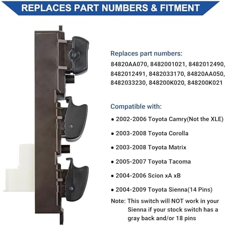 Sponsored Ad - Master Door Lock Window Switch Control Button Compatible with Toyota Camry 2002-2006, Corolla/Matrix 03-08, Sienna 04-09, Tacoma 05-07, Scion xA/xB 04-06, Replace 84820AA070 901-705, 14