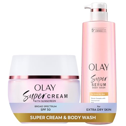 Super Cream with Sunscreen SPF 30 (1.7 oz) + Body Wash for Extra Dry Skin (18.5 oz) - 24hr Long Lasting Hydration - Vitamin C & E, Hyaluronic Acid, Niacinamide - Smooth, Brighten, Firm