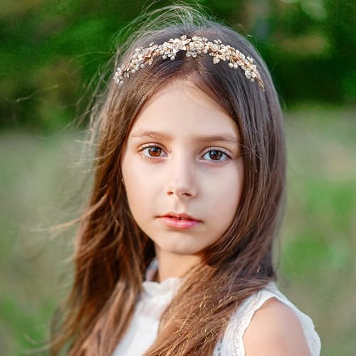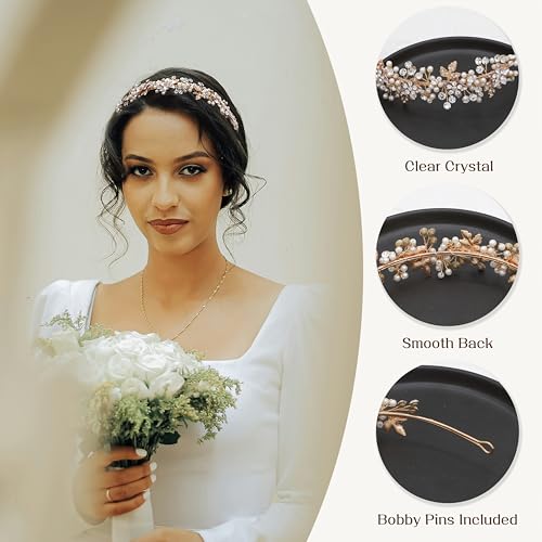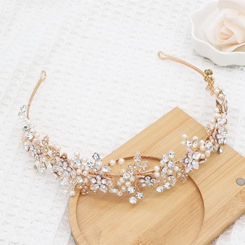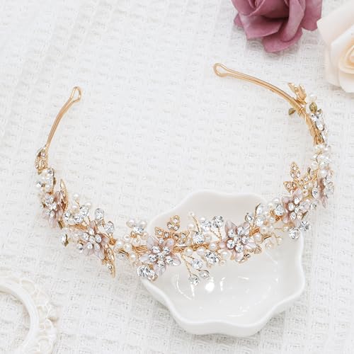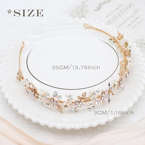 Oriamour Wedding Headbands Bridal Pearl and Crystal Floral Hair Accessories Bridal Headpieces For Bride Women Party Prom (Gold, 18'')