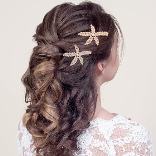 PAGOW 3 PCS Starfish Hair Clips, Gold Pearls Rhinestone Hair Clips, Crystal Sea Star Ponytail Holder, Faux Pearl Crystal Wedding Headpiece Hair Accessories for Women, Bride (3 Styles)