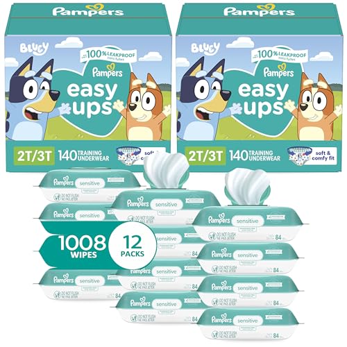 Easy Ups Pull On Training Pants Boys, 2T-3T, 2 Month Supply (2 x 140 Count) with Sensitive Water Based Baby Wipes 12X Multi Pack Pop-Top and Refill (1008 Count)
