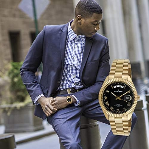 14K All Gold Plated Big Face/Stainless Steel Big Face Luxury Watch with Day Date Windows, Roman Numerals & Coin Edge Fluted Bezel Watch