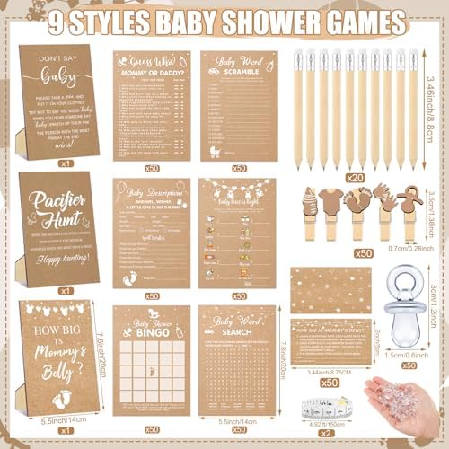 Sherr 476 Pcs Kraft Baby Shower Games 6 Sets Activities Cards Pacifier Hunt Game 50 Pacifiers How Big Is Mommy's Belly Sign 50 Guessing Cards 2 Measuring Tape Don't Say Baby Sign 50 Clothespin