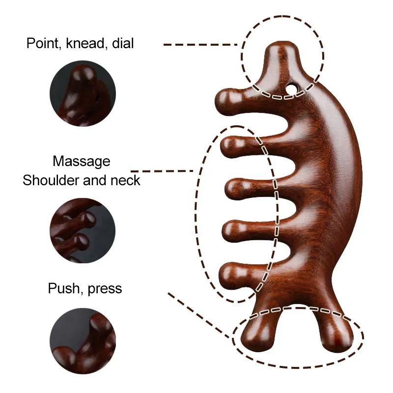Suitability:okay Formulation:ok Performance:ok basic tool. bought this for hair scalp massage (Crescent shaped) and for leg muscle massage (dolphin shaped) pretty okay to use. Solid wood but light weight.