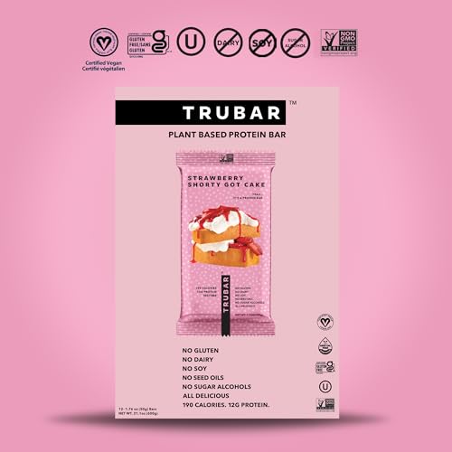 TRUBAR Vegan Protein Bar, Strawberry Shorty Got Cake, Gluten Free, Plant Based Protein, Dairy Free, Non GMO, Soy Free, No Sugar Alcohols, 12G Protein, 12G Fiber, 23G Carb, On the Go Snack Bars, 12 CT