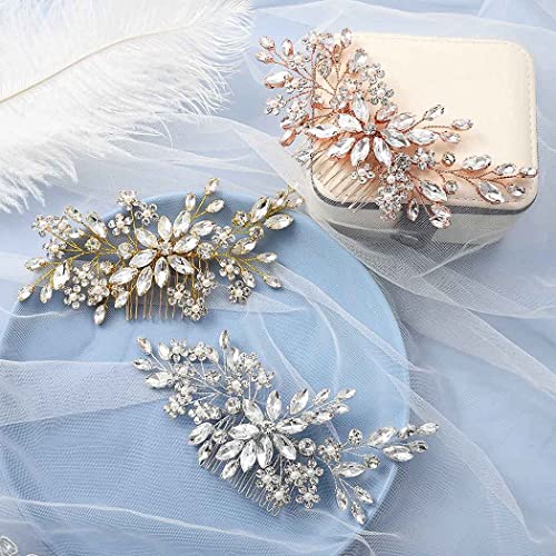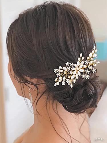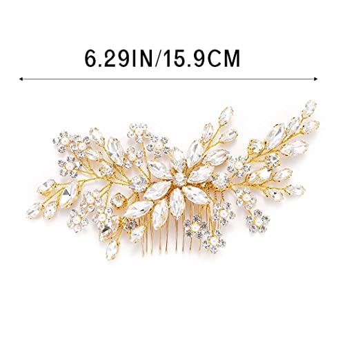 Unsutuo Crystal Bride Wedding Hair Comb Silver Rhinestone Flower Bridal Hair Pieces Pearl Wedding Hair Accessories for Women and Girls… (Gold)