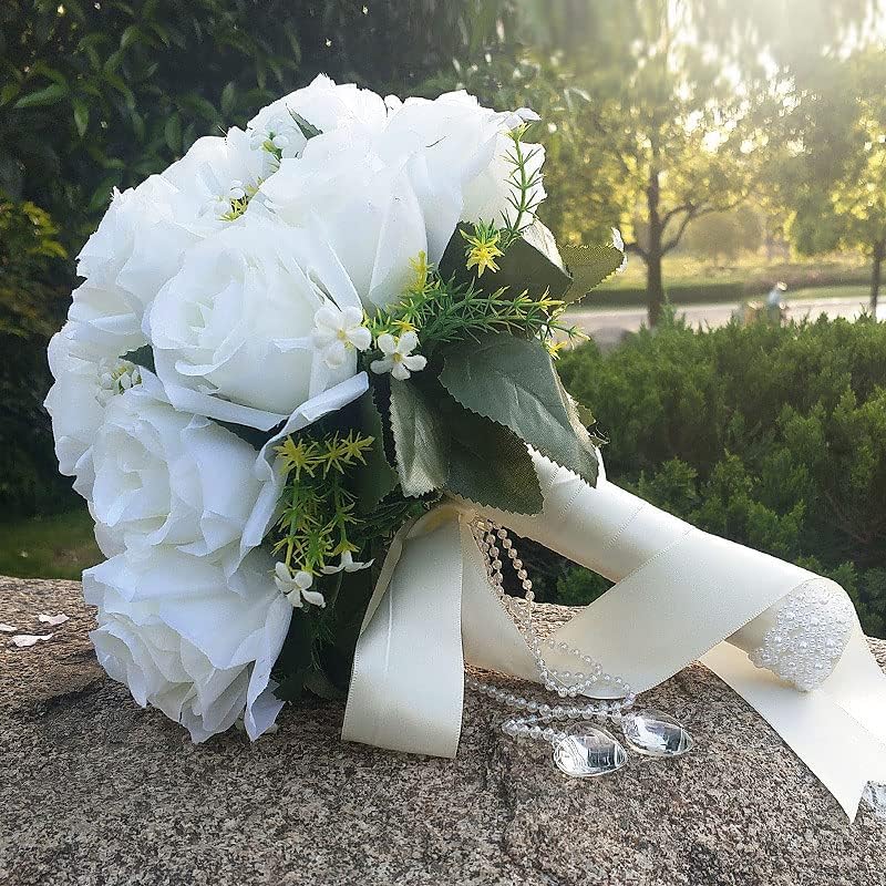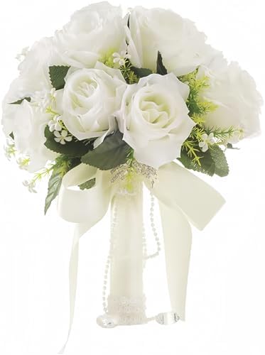 Wowagoga 12 Inch Wedding Bouquet with Pearl Crystals Ribbons,Artificial Rose Flower for Bride Bridesmaids Artificial Fake Flowers Fake Flowers Toss Bouquet for Wedding Party Church(White)